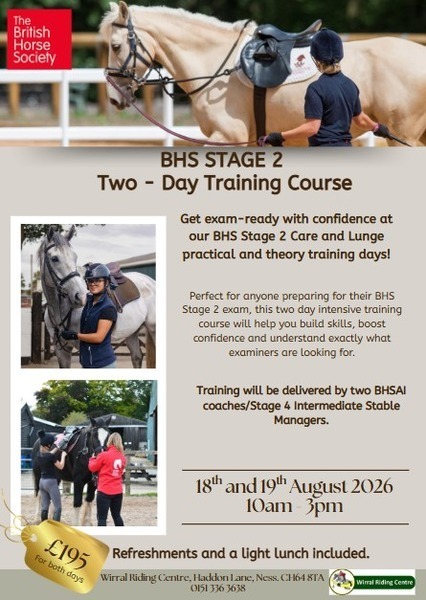 Join us on Tuesday 18th August and Wednesday 19th August from 10am-3pm for a focused and supportive two - day training course, designed to help you succeed in your BHS Stage 2 Care and Lunge exam.